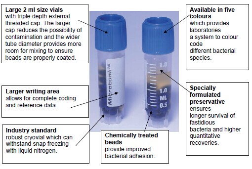 標(biāo)記顏色的25 個(gè)小珠被包裝容納在包含保存劑的保存管里,小珠被沖洗和吸附細(xì)菌在上面,之后保存管在貯存期內(nèi)保持在-70°C,當(dāng)需要培養(yǎng),單個(gè)小珠很簡(jiǎn)單的移出保存管,并直接劃線在微生物培養(yǎng)基上。